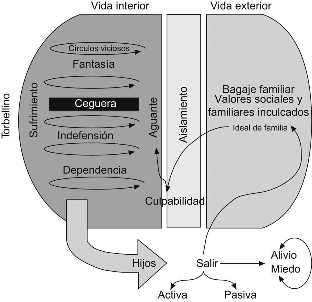 Se realizaron 35 relatos entre septiembre de 2005 y abril de 2007. Las características de las mujeres participantes se recogen en la tabla 1. Se obtuvieron 3.800 códigos que se agruparon en 64 familias. Las mujeres describieron la situación de maltrato como un estado específico («estar dentro») mediante la metáfora del «torbellino», caracterizado por (tabla 2): ceguera: no se ve lo que ocurre alrededor, falta de conciencia; aislamiento: dentro del torbellino se está totalmente aislada, con un sentimiento profundo de soledad e incluso de prisión; indefensión: percepción de total incapacidad para salir de la situación por sí mismas, desconcierto, desamparo, inexplicabilidad y falta de control sobre lo que les ocurre (como una catástrofe de la naturaleza); sufrimiento: amargura, desesperación, dolor profundo que atraviesa todas las facetas y perdura durante toda la vida, incluso en el futuro; destino: su situación es fruto de mala suerte o del sino, manifestando un pensamiento mágico que externaliza la responsabilidad, reduce la reflexión crítica y dificulta la salida; dependencia: estar en el centro del torbellino, aislada y anulada, lleva a una gran dependencia afectiva, a centrarse en lo que se tiene (falta de confrontación); fantasías de amor, protección y cambio: desean e interpretan que él las quiere y las protege; expectativa de que el torbellino es transitorio y pasará; anulación: sobreviven en el interior intentando adaptarse, con apreciación de que eso es su vida aunque reconocen la anulación y la despersonalización que estas cesiones paulatinas producen; círculos viciosos: como en los torbellinos, el giro aumenta la fuerza de las situaciones adversas y alimenta su persistencia (figura 1).