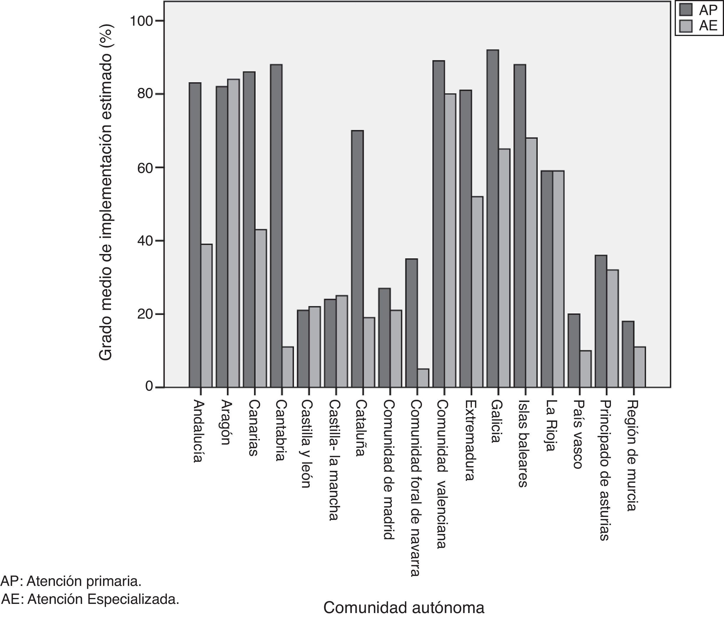 Fase 2Sobre la base del grado de implementación del VE estimado por cada participante como «porcentaje de implementación del VE en su CCAA», dicha modalidad está disponible en todo el territorio español en un 63% para AP (DE 42,3) y un 37% (DE 41,9) para AE (fig. 2). Se encontraron CCAA que se situaron por debajo del 20% de implementación tanto en AP como AE (por ejemplo, Murcia y País Vasco), y otras por encima del 80% de implementación en ambos ámbitos (por ejemplo, Aragón y Comunidad Valenciana). El resto de las CCAA se situó en valores intermedios. No se observaron diferencias significativas entre las estimaciones de los profesionales según trabajaran en zonas rurales o urbanas (p=0,2335).