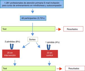 Participantes y emplazamientoSe ofertó entrenamiento en mindfulness a los 1.281 profesionales sanitarios de atención primaria de Navarra y aceptaron 48. Se asignaron por sorteo 25 participantes al grupo intervención, quedando los 23 restantes en el grupo control.