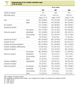 Estudio descriptivo transversal mediante encuesta autoadministrada y anónima, con la participación de todos los adolescentes que cursan estudios en un instituto de educación secundaria situado en una zona urbana de Jaén capital, de nivel socioeconómico y cultural medio, y cuyo proyecto curricular de centro se adecua a la LOGSE (Ley 1/1990 de 3 de octubre). Se realizan 3 encuestas en años diferentes (1997, 2001 y 2004), durante el último trimestre de cada curso escolar, administradas por profesores adiestrados para tal fin, y se recogen datos relacionados con la edad, el sexo y el consumo de alcohol, tabaco y drogas ilegales, diferenciando la forma de consumo (intermitente, durante el fin de semana o diario). La cantidad de alcohol se cuantifica en unidades de bebida estándar (UBE) por semana y el tabaco, como número de cigarrillos diarios.