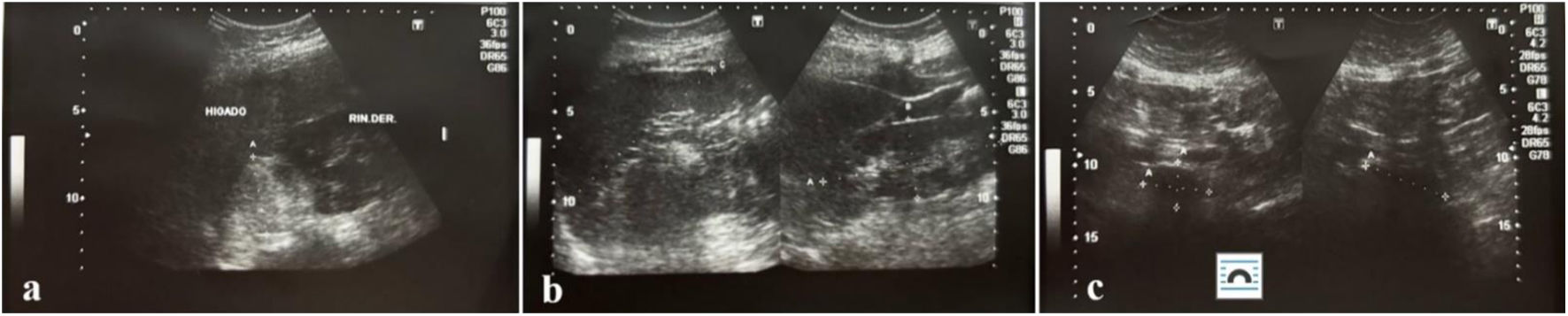 Imágenes ecográficas renal y pélvica a los 6 meses de la evaluación inicial. a) Hígado y riñón derecho en forma y situación anatómica normal, bordes regulares y bien definidos, ecoestructura interna homogénea con ecogenicidad dentro de la normalidad b). Se observa en el espacio hepato-renal una masa redondeada a determinar. c) En el espacio hepato-renal, masa redonda hiperecoica de 44mm.