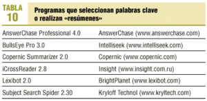 Se trata de programas desarrollados a partir de los multibuscadores y que a partir de los resultados obtenidos, mediante un módulo de indización, ofrecen una serie de palabras clave descriptivas de los contenidos de las sedes seleccionadas o incluso un pequeño «resumen» construido mediante extracción de frases significativas del texto (tabla 10).