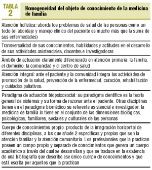 La medicina de familia y comunitaria es un área de conocimiento específica, cuyo cuerpo doctrinal horizontal se nutre de competencias genéricas y del conocimiento transversal de múltiples ciencias, al igual que otras disciplinas que tienen características parecidas (pediatría). Es un área de conocimiento específica, por estar dirigida a la persona como un todo, y su abordaje es mucho más que la suma de diferentes parcelas. La homogeneidad de su objeto de conocimiento viene determinada por diversos aspectos (tabla 2).