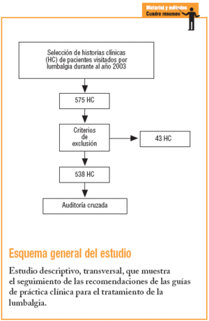 De todos los pacientes visitados en el centro entre enero y diciembre del 2003, se seleccionó a los que habían acudido por un primer episodio o una reagudización de lumbalgia y cuyo registro en el sistema OMI-AP era lumbalgia (códigos L03 y L86). Se obtuvo un total de 575 historias clínicas (HC) que cumplían este requisito. De éstas se excluyeron: a) las historias que tenían una mala codificación del episodio y en las que, a pesar de estar codificado como lumbalgia, no se tratara de esta enfermedad; b) los pacientes en los que el seguimiento de la enfermedad no se realizara en el centro o bien que el curso clínico fuera sólo el seguimiento por el especialista; c) aquellas en las que en el curso clínico sólo hubiera una prescripción sin valoración de la enfermedad en nuestro centro. El número final de HC fue de 538. La recogida de datos se estableció mediante una auditoría interna cruzada, de forma que cada uno de los profesionales no auditara sus propias historias.
