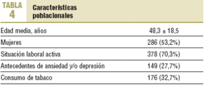 De los 538 pacientes que consultaron por lumbalgia, el 53,2% era mujer. La edad media fue de 48,3 ± 18,5 años y el 33,6% tenía más de 55 años. La mayoría de ellos estaban en régimen activo. Las características de la población incluida en el estudio se resumen en la tabla 4.