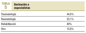 Se solicitó alguna prueba de imagen (radiografia, tomografía computarizada, resonancia magnética) o electromiograma al 26% de los pacientes. Se remitió a algún especialista al 12,1% de los pacientes. La derivación según especialidades se detalla en la tabla 5.