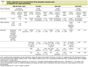 Las recomendaciones PAPPScv se basan explícitamente en la adaptación que ha realizado el CEIPC3 del consenso europeo EJTF2. En la tabla 1 se resumen las 3 recomendaciones, a las que se añade, por facilitar comparaciones, la norteamericana NCEP-ATP-III (con las innovaciones de 2004)33.