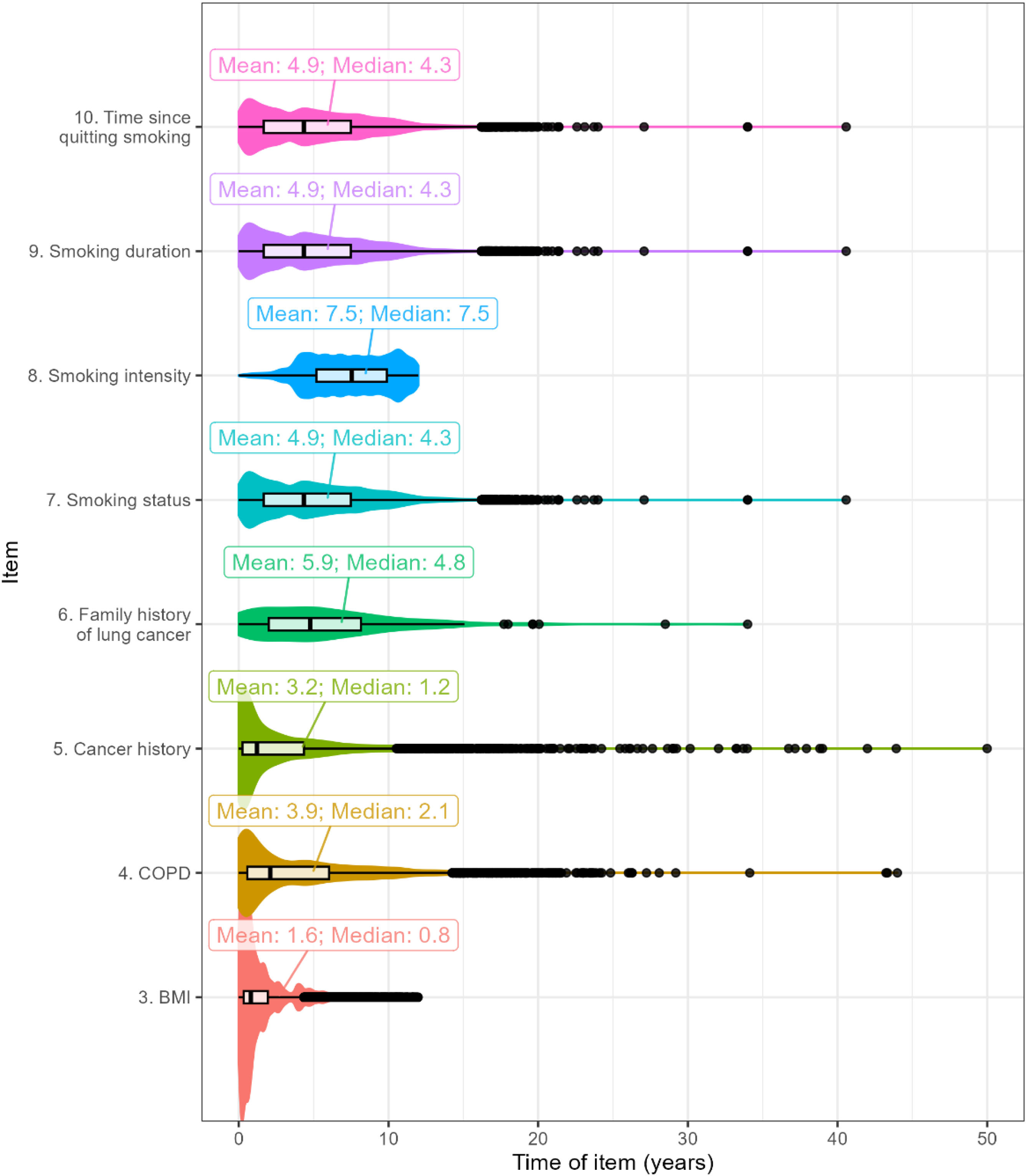 The age of the most up-to-date information available in the EHR to calculate the different items of the score was analyzed. The age ranged from 1.6 years for BMI (item 3) to 7.5 years for smoking intensity (item 8) (see Fig. 2). Notably, the items with the greatest impact on the score (items 8 and 6) had the longest time since their last update, indicating a potential gap in the timeliness of critical data.