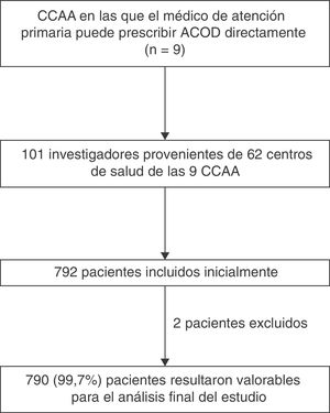 MétodosEs un estudio observacional transversal, nacional y multicéntrico, realizado en las 9 comunidades autónomas en las que el médico de AP puede establecer la indicación y la prescripción de un ACOD (Galicia, Madrid, País Vasco, Navarra, Aragón, Andalucía, Cataluña, Valencia y Baleares). Los criterios de inclusión de los pacientes fueron: edad igual o mayor de 18 años, diagnosticados de FANV con riesgo de ictus o embolia sistémica atendidos en consultas de AP, que recibiesen tratamiento crónico con anticoagulantes, que actualmente estuviesen en tratamiento con un ACOD durante al menos 3 meses antes de la inclusión, que la indicación del ACOD hubiese sido establecida por el médico de AP, y que otorgasen su consentimiento informado por escrito. Los criterios de exclusión fueron: pacientes que hubiesen modificado su tratamiento anticoagulante durante un periodo inferior a 3 meses antes de la inclusión; pacientes con un deterioro cognitivo que impidiese la comprensión del redactado de la hoja de información para el paciente, del consentimiento informado o la realización de cuestionarios autoadministrados; o pacientes cuyo inicio del tratamiento anticoagulante para FANV fuese un ACOD.