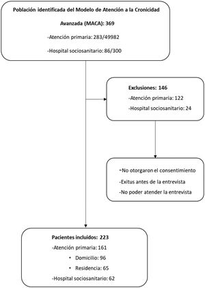 La población de estudio fueron pacientes con ECA de la comunidad y de un HCI y se seleccionó mediante un corte transversal en cada uno de los tres EAP y tres cortes en el hospital (cada tres meses para evitar duplicaciones por ingresos de larga duración). Se seleccionaron todos los pacientes con identificación MACA en el momento de corte. Los criterios de exclusión fueron no encontrarse en el área de estudio en el momento de las entrevistas, incapacidad de participar en la entrevista por su estado físico o psicológico, y que el paciente o su tutor/cuidador principal rechazara la participación. Los pacientes con deterioro cognitivo avanzado no se excluyeron: se utilizaron escalas adaptadas a su condición y se asumieron pérdidas en parte de los datos.
