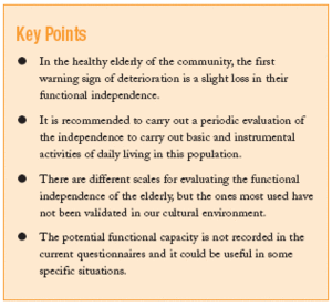 The independent performance of these activities has a significant impact on the health of the elderly. It has been associated with higher levels of self-perceived health and a direct association with mortality has also been shown.
