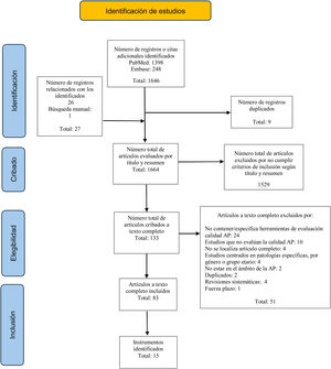 Criterios de inclusión1) Estudios de validación de instrumentos de evaluación específicos para medir la calidad de la AP o la satisfacción del paciente, proveedores o gestores; 2) en el ámbito de AP, y 3) publicados desde el 1/01/2013 hasta el 1/02/2023. Se incluyeron 83 artículos a texto completo.