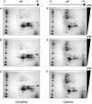 After digitalization of 2D gels, three images of each condition were integrated into a virtual master gel (Figure 3). The comparative analysis of master gels showed that 84 spots were detected in the control crystalline samples, while the master gel of cataract displayed 123 spots. Only 27 spots were shared between crystalline and cataract master gels, whereas 96 spots were different. From crystalline samples, all spots were located in one of four clearly identified regions in the master gel; in contrast, the spot distribution of cataract samples was markedly disorganized (Figure 3).