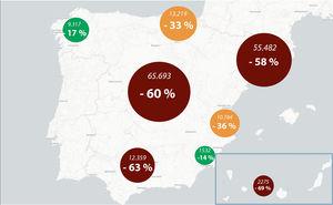 Mapa de España que muestra la reducción de cirugía de cardiopatías congénitas por CC. AA. y la incidencia acumulada de casos de COVID-19 en esas comunidades con fecha 14-05-2020. En rojo CC. AA. con reducción superior al 50% (Canarias, Andalucía, Madrid y Cataluña), en amarillo CC. AA. con reducción entre el 20 y 50% (Comunidad Valenciana y País Vasco), y en verde CC. AA. con reducción inferior al 20% (Galicia y Murcia). El color de la figura solo puede apreciarse en la versión electrónica del artículo.