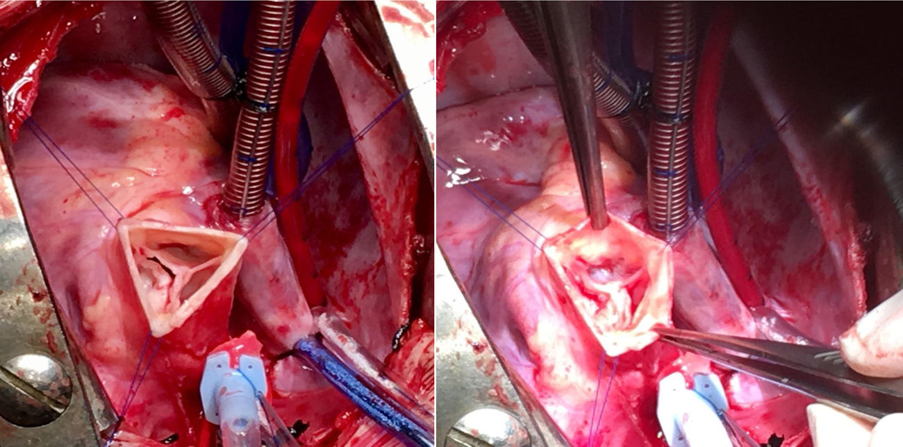 El segundo paciente fue un adulto de 66 años, operado en la infancia de un cierre de la comunicación interauricular. Presentaba una alta incidencia familiar de cardiopatía congénita sin aislamiento de un sustrato genético. Tenía una IM grado iv por restricción del velo posterior con un anillo mitral de 64mm y una IT grado ii con anillo tricuspídeo de 47mm. Se realiza una plastia mitral con anillo de CG Future® de 36mm (Medtronic) con implante de neocuerda en segmento A1 y una anuloplastia tricuspídea con anillo Contour 3D® de 36mm (Medtronic). Presenta bloqueo auriculoventricular completo en el postoperatorio inmediato, por lo que se implanta un marcapasos definitivo al sexto día postoperatorio. A las 24h de la intervención se realiza un cateterismo de urgencia por infarto postoperatorio. Se objetiva acodamiento de la coronaria derecha debido a un punto del anillo tricúspide. Dado que la repercusión solo era bioquímica, sin alteración en la contractilidad, se decide tomar una actitud conservadora y el paciente evoluciona de manera satisfactoria. No obstante, a los 20 días de la intervención el paciente presenta de manera súbita disnea y ortopnea. Se objetiva dehiscencia de la porción posterior del anillo mitral (fig. 1), por lo que se interviene de urgencia implantando una prótesis mitral mecánica Carbomedics® 31mm.