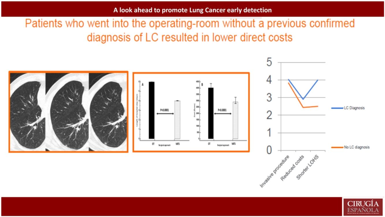 ConclusionesLos resultados sugieren que indicar la resección quirúrgica del cáncer de pulmón basándose en los criterios del Comité Multidisciplinar del Cáncer, en lugar de realizar una biopsia pulmonar percutánea guiada por TAC, puede suponer una disminución significativa del coste y de la duración de la estancia hospitalaria.