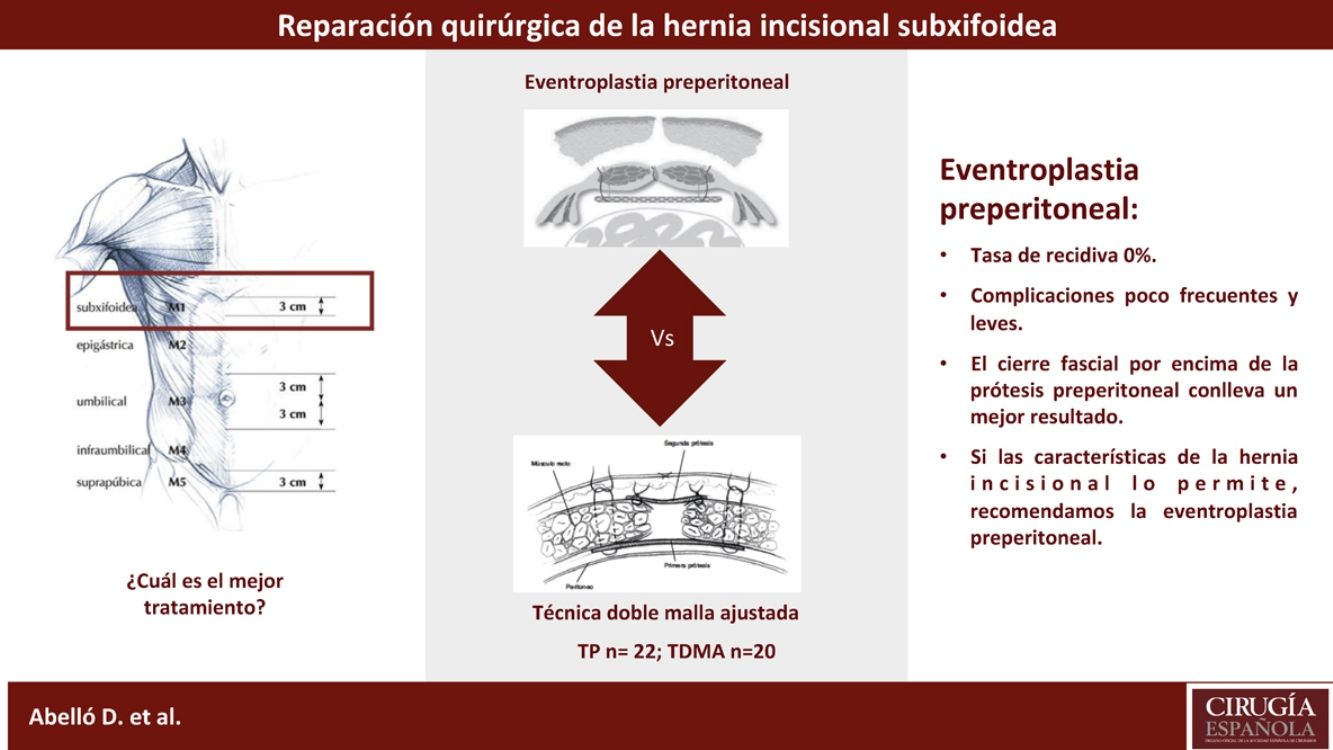 ConclusionesSegún nuestros resultados, la TP fue la técnica ideal para reparar una hernia incisional subxifoidea. La técnica de doble malla ajustada puede representar un abordaje eficaz con un bajo índice de complicaciones, aunque analizando globalmente la tasa de recidiva, el cierre fascial por encima de la prótesis preperitoneal conlleva un menor impacto en la misma.