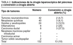 Las indicaciones del abordaje laparoscópico se concentraron tanto en el tratamiento de tumores de páncreas benignos como malignos (tabla 2).