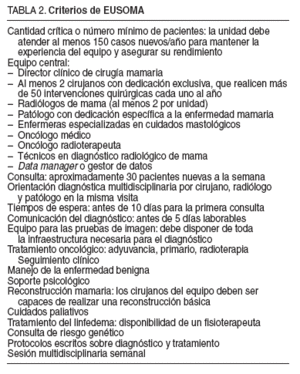 Son requisitos obligatorios, según EUSOMA, la cantidad crítica o número mínimo de pacientes, determinado en 150 casos nuevos de cáncer de mama al año; la formación especializada en cáncer de mama de los miembros del equipo central (cirujanos de mama, radiólogos de mama, patólogo de mama, oncólogo mamario, enfermeras y técnicos de radiodiagnóstico), y la incorporación de un data manager o gestor de datos al equipo central, responsable de la recopilación y organización de los datos y resultados que posteriormente se cotejarán con los objetivos de calidad predefinidos. En la tabla 2 se exponen los criterios más destacados de EUSOMA.