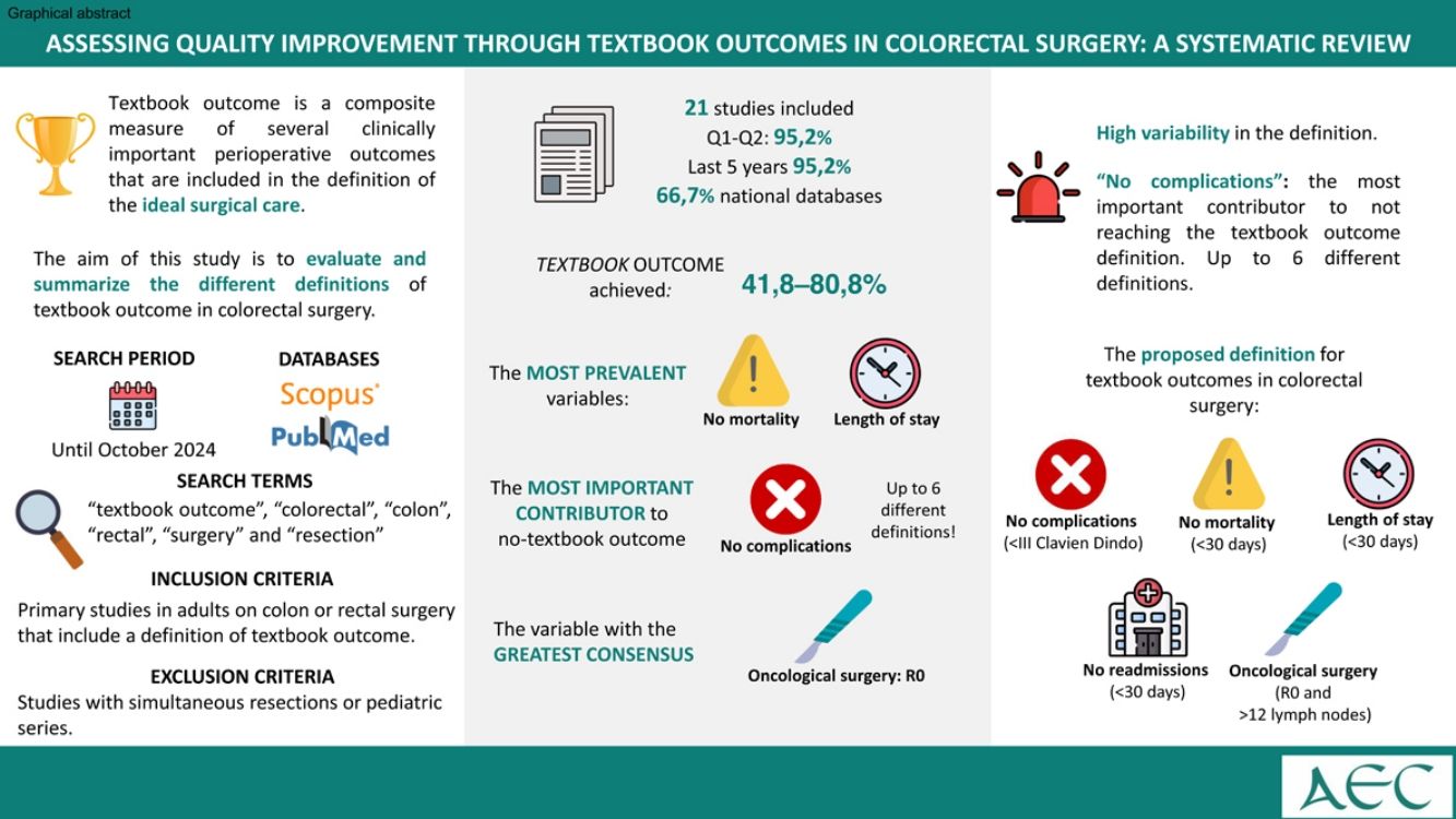 El textbook outcome es una medida compuesta de varios resultados perioperatorios clínicamente relevantes que se incluyen en la definición de proceso quirúrgico ideal. El objetivo de este estudio es resumir las diferentes definiciones sobre textbook outcome en cirugía colorrectal. Se llevó a cabo una revisión sistemática según PRISMA hasta abril de 2025. Se incluyeron estudios primarios sobre pacientes adultos sometidos a resección de colon o recto y que evaluaran textbook outcome. Se incluyeron 21 estudios para su revisión. Los textbook outcome alcanzados variaron del 41.8% al 80,8%. Las variables más prevalentes fueron "no mortalidad" y "estancia hospitalaria" (85.7%). La variable que contribuyó principalmente a no alcanzar con la definición de textbook outcome fue "no complicaciones" (42.9%) con 6 posibles definiciones. Como resultado de la variabilidad descrita, se debe alcanzar un consenso para validar la extensión de esta herramienta. La definición propuesta para los textbook outcome en cirugía colorrectal sería la siguiente: no complicaciones (>III Clavien-Dindo), estancia hospitalaria (<percentil 75),="" no="" reingresos="" (<30="" días),="" mortalidad="" días)="" y="" cirugía="" oncológica="" (resección="" r0=""> 12 ganglios linfáticos).</percentil>