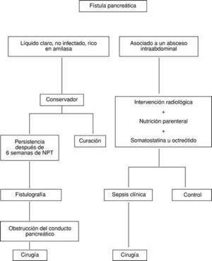 El tratamiento quirúrgico será necesario en pacientes en los que el drenaje percutáneo de un absceso abdominal fracasa o en presencia de una fístula biliar y pancreática con manifestaciones clínicas de sepsis. El reconocimiento de una dehiscencia pancreática incontrolada con sepsis intraabdominal debe ser precoz, realizándose una rápida evaluación de otros potenciales focos sépticos (fig. 1). El tratamiento quirúrgico está, asimismo, indicado en pacientes en los que tras 6 semanas de tratamiento conservador no se produce el cierre de la FP; debe sospecharse una obstrucción del conducto pancreático que se investigará mediante fistulografía (tabla 5 y fig. 1).