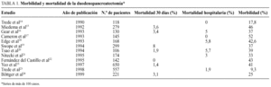 En la última década se ha producido un significativo descenso de la mortalidad operatoria de la duodenopancreatectomía cefálica. Craighead y Lien11, en 1958, observaban una mortalidad del 51 y del 61% en la pancreatectomía total. Gudjonsson12, en 1987, en una revisión de la bibliografía de 1980-1987, hallaba una mortalidad del 16%. En 1997, Yeo et al13 presentan una mortalidad del 1,4%, en una serie de 650 duodenopancreatectomías cefálicas realizadas entre 1990 y 1996. En la actualidad, la mortalidad de la duodenopancreatectomía, en la mayoría de centros con una amplia experiencia en la técnica14-24, no supera el 3% (tabla 1), habiéndose publicado series extensas sin mortalidad14,17,22. Este descenso en la mortalidad operatoria es multifactorial13,25: cirujanos con mayor experiencia, capaces de realizar la intervención en menos tiempo y con menor pérdida de sangre, mejores cuidados pre y postoperatorios, mejor técnica anestésica y soporte nutricional adecuado.