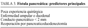 Marcus et al63 hallan una incidencia de fístula pancreática del 36% en los pacientes con un páncreas pequeño, frágil y blando, sin dilatación ductal, frente a un 2% en los páncreas fibróticos. En la serie del Johns Hopkins61 los factores predictores del riesgo de FP fueron un número bajo de intervenciones por cirujano y resecciones por lesiones ampulares y duodenales. En la serie de la Universidad de Amsterdam50 las lesiones ampulares y un Wirsung con un diámetro inferior a 2 mm se asociaron a una mayor incidencia de FP. En la serie del MD Anderson de la Universidad de Texas64 la reoperación fue el factor que se asoció con mayor incidencia de FP tras duodenopancreatectomía.