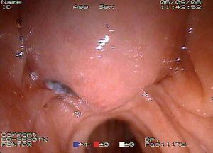 Mujer de 87 años que ingresa en el servicio de cirugía por ictericia, colangitis y pancreatitis aguda. Se instauró tratamiento con sueroterapia y antibióticos, que consiguió la estabilización hemodinámica de la paciente. En una colangiopancreatografía por resonancia magnética (fig. 1) se observó un defecto de repleción en el colédoco distal. Con la intención de desobstruir la vía biliar, se realizó una colangiopancreatografía retrógrada endoscópica (CPRE), empleando sedación consciente con midazolam y dolantina. En la endoscopia, la ampolla de Vater se encontró muy abultada, con un orificio en el que parecía entreverse una coledocolitiasis (fig. 2). Se realizó una esfinterotomía biliar amplia (fig. 3) y se extrajo una coledocolitiasis de 13 mm de diámetro máximo, que estaba impactada en la ampolla (fig. 4). La evolución de la paciente fue satisfactoria.