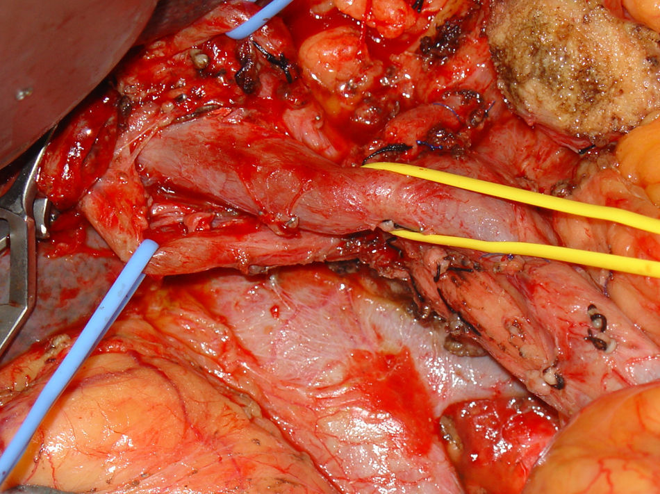 Extensión de la resección quirúrgicaLa DPC incluyó una antrectomía. La linfadenectomía incluyó el ligamento hepatoduodenal, la arteria hepática común y el espacio interaortocava infraduodenal (fig. 1). La reconstrucción se hizo mediante asa en Y de Roux, con pancreático-yeyunostomía ducto-mucosa, o pancreático-yeyunostomía término-lateral en los pacientes con ducto pancreático menor de 2mm. Las anastomosis ducto-mucosas fueron tutorizadas con un catéter de silicona 20G (0,9mm). Se practicó resección de la vena mesentérica superior o porta en los casos con sospecha de infiltración local.