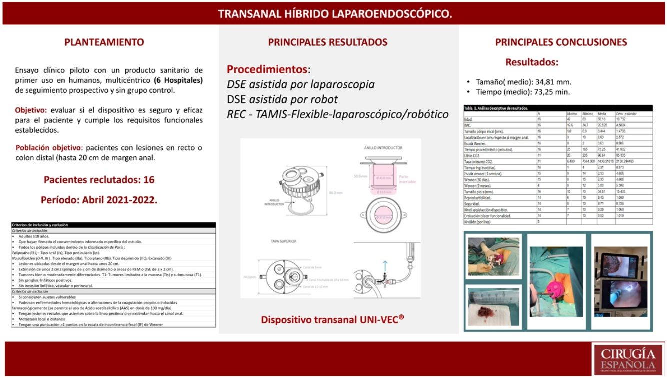 Los resultados del presente estudio clínico piloto con 16 pacientes han demostrado la eficacia y seguridad del dispositivo UNI-VEC® para el tratamiento de las lesiones rectales, mostrando ser un dispositivo que optimiza el trabajo conjunto de los cirujanos y endoscopistas permitiendo el empleo concomitante de instrumentación laparoscópica rígida y la propia de la endoscopia flexible. Se ha mostrado asimismo como una plataforma transanal segura y versátil para ser empleada en entornos robóticos transanales.