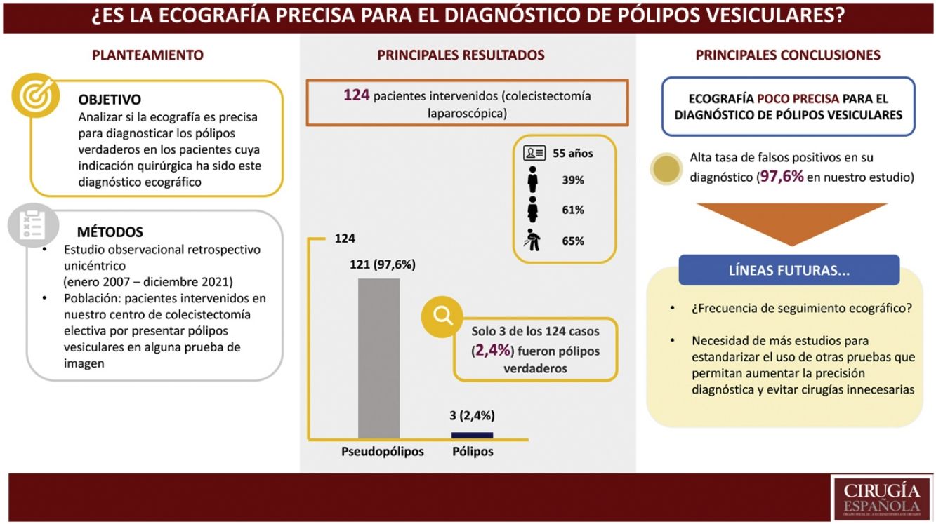 La incidencia de pólipos vesiculares es del 0,3-12%. Es importante diferenciar los seudopólipos (pólipos de colesterol, adenomiomatosis o pólipos inflamatorios) de los pólipos verdaderos (adenomas y adenocarcinomas). Los principales factores de riesgo de malignización son el tamaño superior a 6-10mm, crecimiento rápido del mismo, morfología sésil, etnia india y colangitis esclerosante primaria. La ecografía es el gold standard para su diagnóstico. Sin embargo, la mayoría de los pólipos diagnosticados por ecografía son seudopólipos. El objetivo del estudio es analizar si la ecografía es precisa para diagnosticar los pólipos verdaderos en los pacientes cuya indicación quirúrgica ha sido este diagnóstico ecográfico.