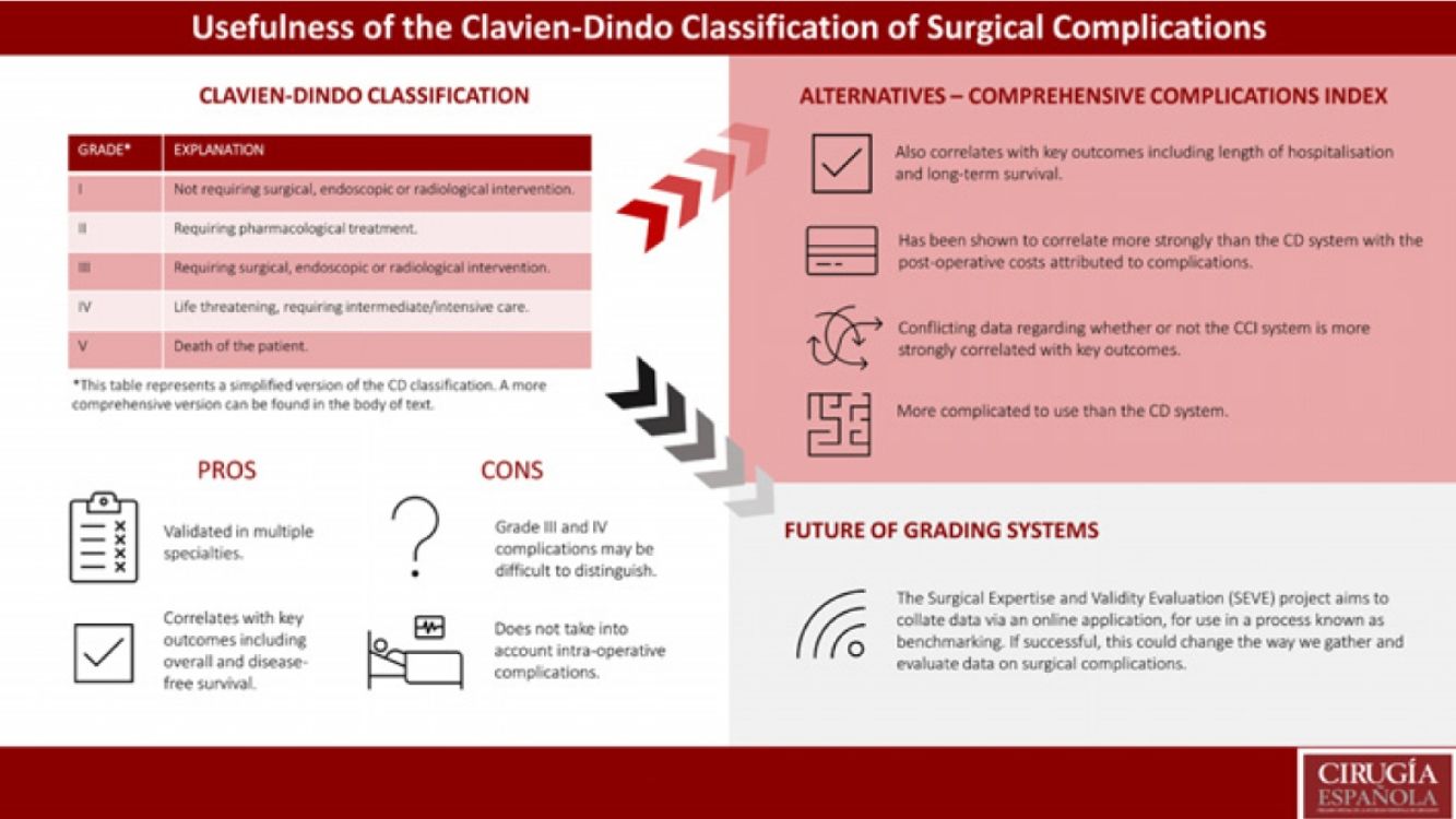 La clasificación de Clavien-Dindo (CD) es ampliamente utilizada en la notificación de complicaciones quirúrgicas en la literatura científica. Agrupa las complicaciones en función del nivel de intervención necesario para resolverlas y se beneficia de la simplicidad y la facilidad de uso, que contribuyen a su alta fiabilidad entre evaluadores. Ha sido validado para su uso en muchas especialidades debido a la fuerte correlación con las medidas de resultado clave, incluida la duración de la estancia, la calidad de vida posquirúrgica y la remuneración relacionada con el caso. Las limitaciones de la clasificación incluyen la preocupación por diferenciar las complicaciones de grado III y IV y no clasificar las complicaciones intraoperatorias. El Índice Integral de Complicaciones es una adaptación de la clasificación de CD que genera una puntuación de morbilidad de 0 a 100. Se ha propuesto como un método más efectivo para evaluar la carga de morbilidad de los procedimientos quirúrgicos. Sin embargo, sigue siendo menos popular ya que los cálculos de morbilidad son complicados y requieren mucho tiempo. En los últimos años ha habido sugerencias de adaptaciones a la clasificación de CD como la clasificación de Clavien-Dindo-Sink, mientras que en algunas especialidades se han propuesto clasificaciones completamente nuevas debido a la evidencia de que la clasificación de CD no es confiable. De manera similar, el proyecto de Evaluación de Validez y Experiencia Quirúrgica tiene como objetivo determinar puntos de referencia contra los cuales los cirujanos pueden comparar su propia práctica.