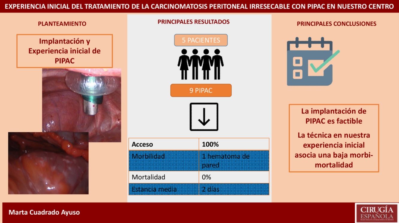 Podemos concluir que la implantación de PIPAC en un hospital público de tercer nivel es factible. La experiencia inicial en nuestro centro ha puesto de manifiesto que se trata de una técnica segura asociada a una estancia hospitalaria corta, si bien es necesaria la realización de estudios controlados para llegar a establecer su eficacia y sus indicaciones.