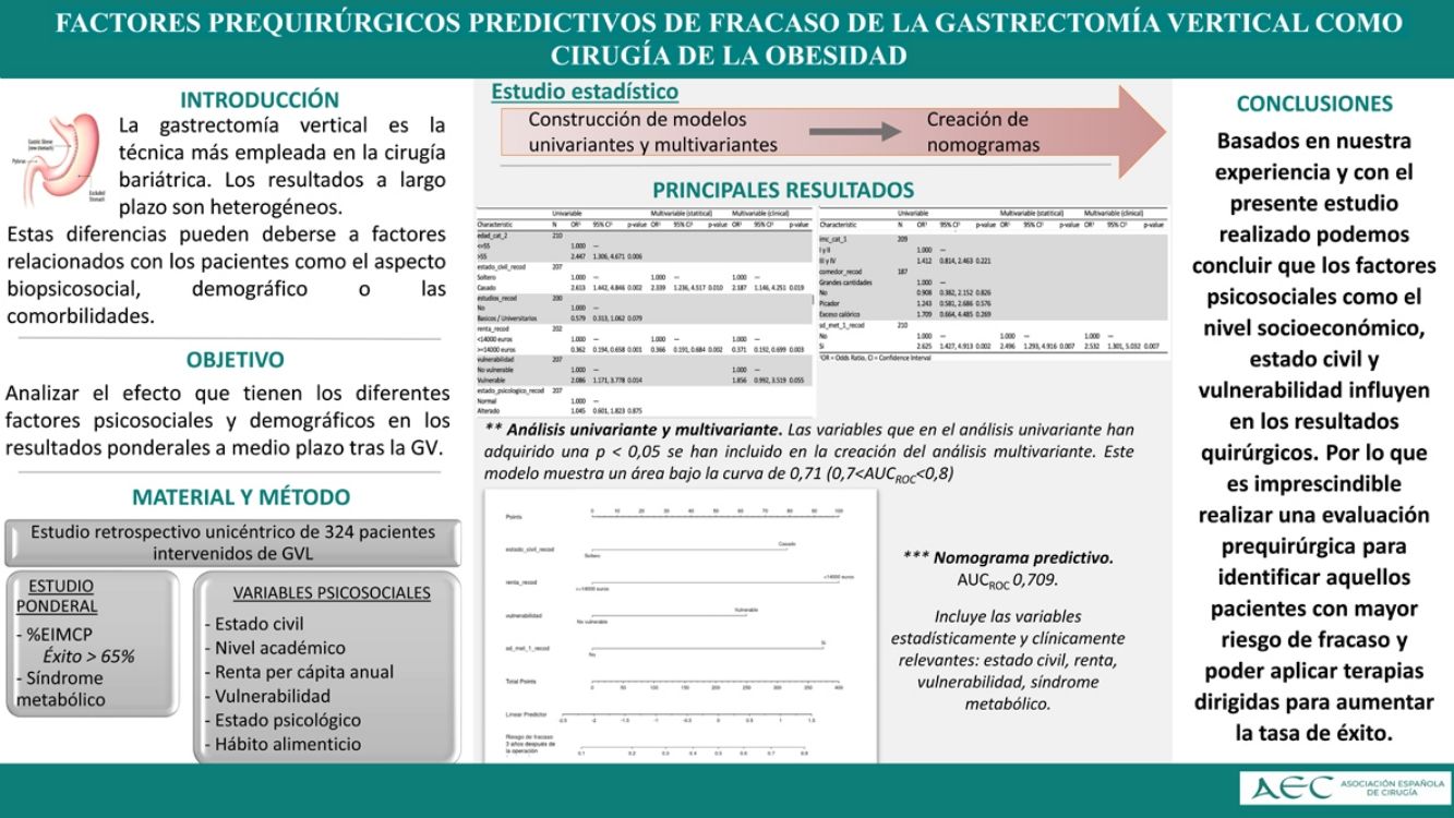 La gastrectomía vertical (GV) es la técnica más empleada, no obstante, los resultados a largo plazo son heterogéneos debido a la influencia de múltiples factores. El objetivo del estudio fue analizar el efecto que tienen los diferentes factores psicosociales y demográficos en los resultados ponderales a medio plazo.
