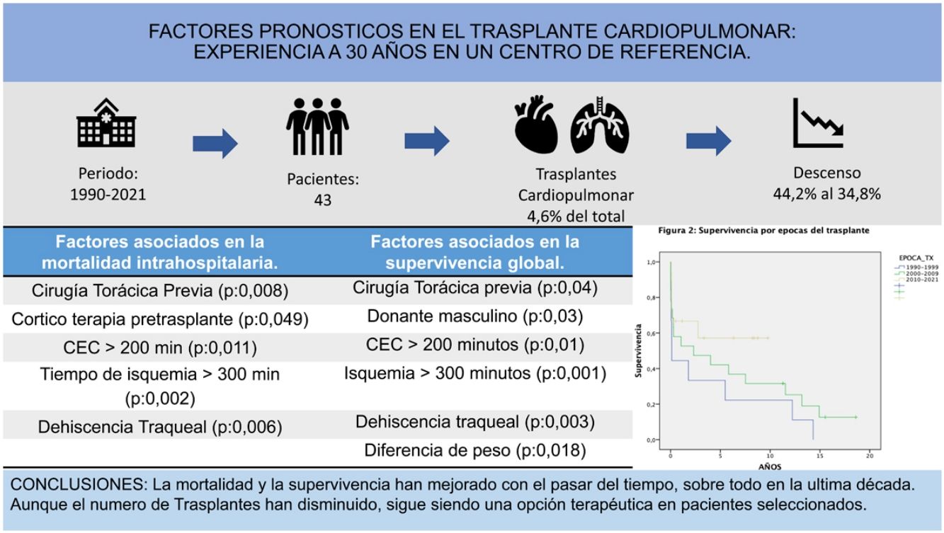 A modo de conclusión, observamos que existe una disminución progresiva en el número de procedimientos, secundario a cambios en las indicaciones y una mejora importante de la mortalidad precoz y de la supervivencia del TCP en la última década. Los factores del receptor como los antecedentes de cirugía previa y uso de corticoides, del procedimiento, como la excesiva prolongación de los tiempos de isquemia y CEC, como la presencia de complicaciones graves (hemotórax y dehiscencia traqueal) afectaron negativamente a la mortalidad precoz y la supervivencia a largo plazo. Algunas variables relacionadas con el donante (sexo masculino y mayor tamaño) impactaron de forma negativa en la supervivencia a largo plazo. El TCP sigue siendo una opción de tratamiento eficaz en pacientes altamente seleccionados.