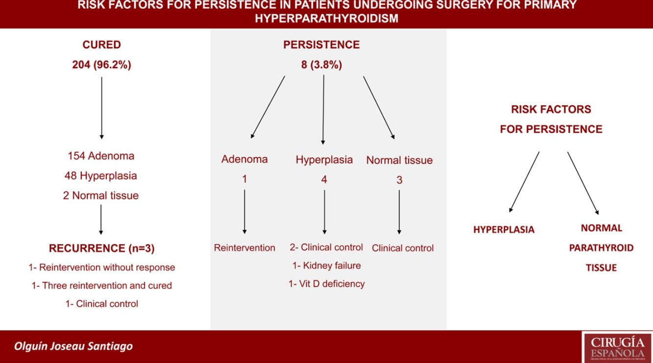 ResultsWe included 212 patients. Mean age was 59 years and 83% were women. Cure was observed in 204 patients (96.2%), persistence in 8 (3.8%) and recurrence in 3 (1.4%). Four patients (1.9%) presented normocalcemia and persistently elevated PTH after surgery. All presented parathyroid pathology (2 adenomas and 2 hyperplasia). In follow-up we observed that adenoma subgroup presented one patient with CKD and one with vitamin D deficiency while in the hyperplasia subgroup two patients presented CKD. Persistence was independently associated with hyperplasia (Odds ratio=12.6, IC95%=1.28-124, p=0.030) and normal parathyroid tissue (Odds ratio=188, IC95%=9.33-379, p=0.001) on histopathological report.