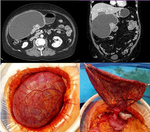 Mujer de 67 años de edad, estudiada por plenitud postprandial y pérdida de peso. Se le practica tomografía computarizada (TC) encontrándose una masa en antro gástrico de 18 x 10 cm compatible con quiste de duplicación. Fue intervenida realizándose una evacuación controlada del contenido y posterior sección del pedículo con endograpadora. El resultado anatomopatológico fue de proliferación fusocelular con estroma fibromixoide compatible con fibromixoma plexiforme. Se trata de una neoplasia mesenquimal benigna rara, descrita recientemente y de localización antral. Son propias del adulto de edad media, presentándose con clínica muy heterogénea y su diagnóstico diferencial debe realizarse con otras lesiones mixoides de la pared gástrica (fig. 1).