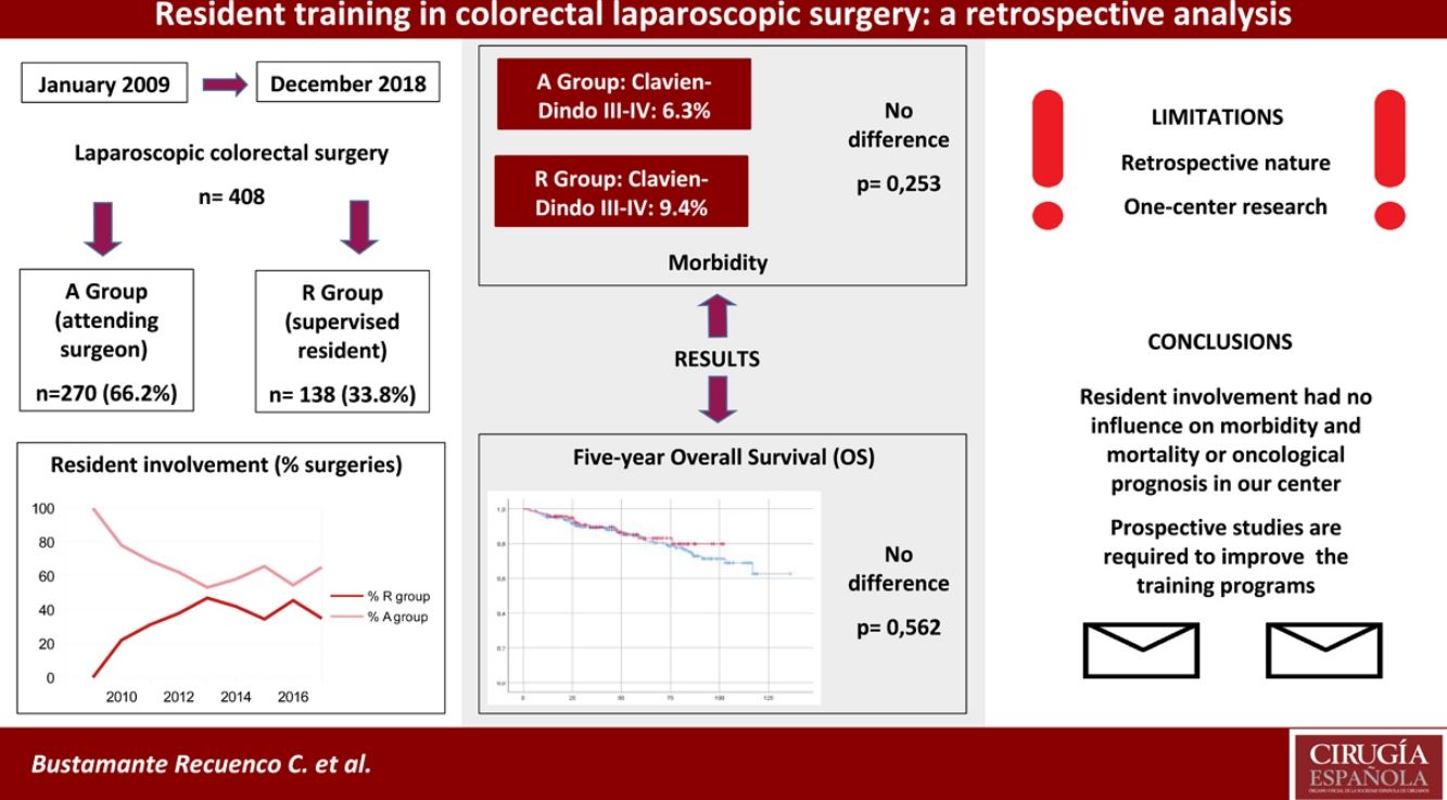 MethodsA retrospective longitudinal single-center study that included all laparoscopic colorectal surgical procedures performed by residents (R group) and by attending surgeons (A group) between 01/01/2009 and 12/31/2017, maintaining follow-up until 12/31/2018. Postoperative morbidity and mortality, overall survival (OS) and disease-free survival (DFS), as well as their relationship with the resident involvement as first surgeon were analyzed.