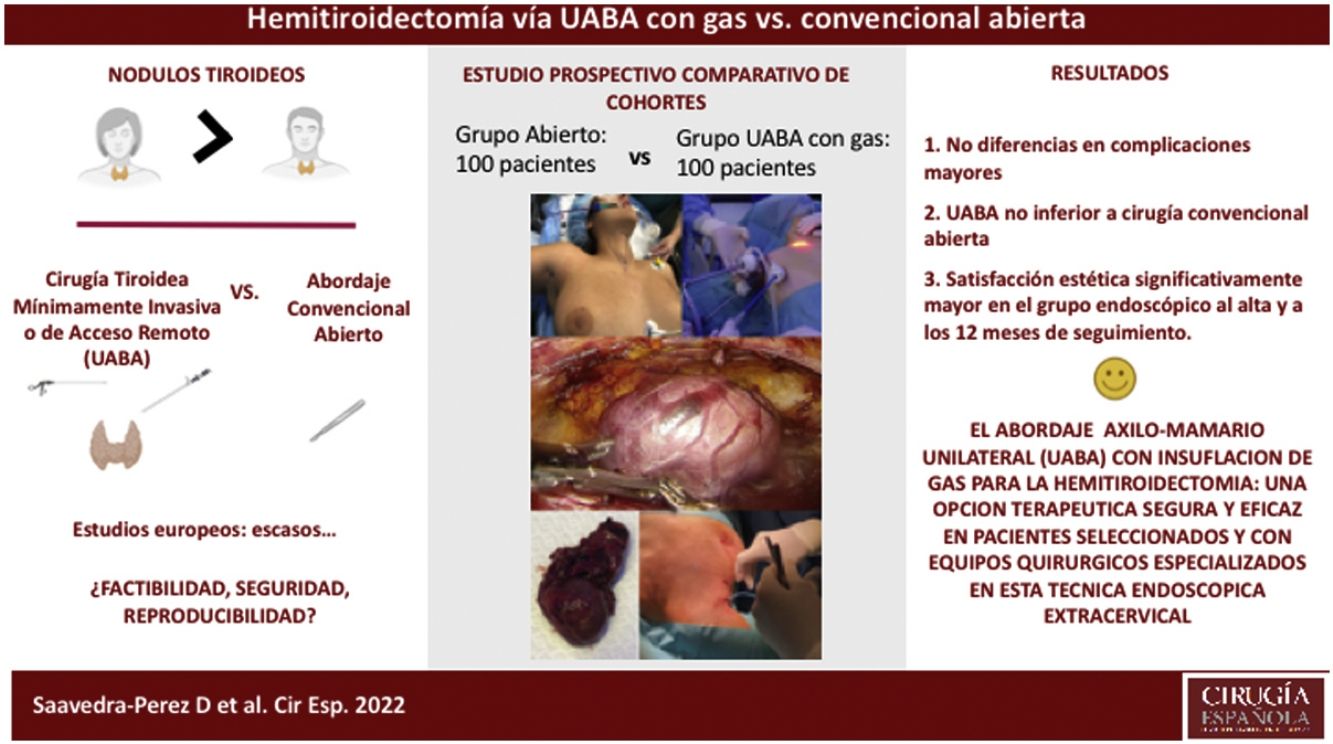 En conclusión, podemos decir que nuestros resultados sugieren que en pacientes seleccionados y con equipos quirúrgicos experimentados en cirugía endocrina y mínimamente invasiva, especializados en la UABA con insuflación de gas, esta técnica para la hemitiroidectomía puede representar una opción terapéutica segura y eficaz para el tratamiento de patologías tiroideas unilaterales, con un perfil de complicaciones mayores similar a la cirugía abierta convencional, pero con un resultado estético excelente.