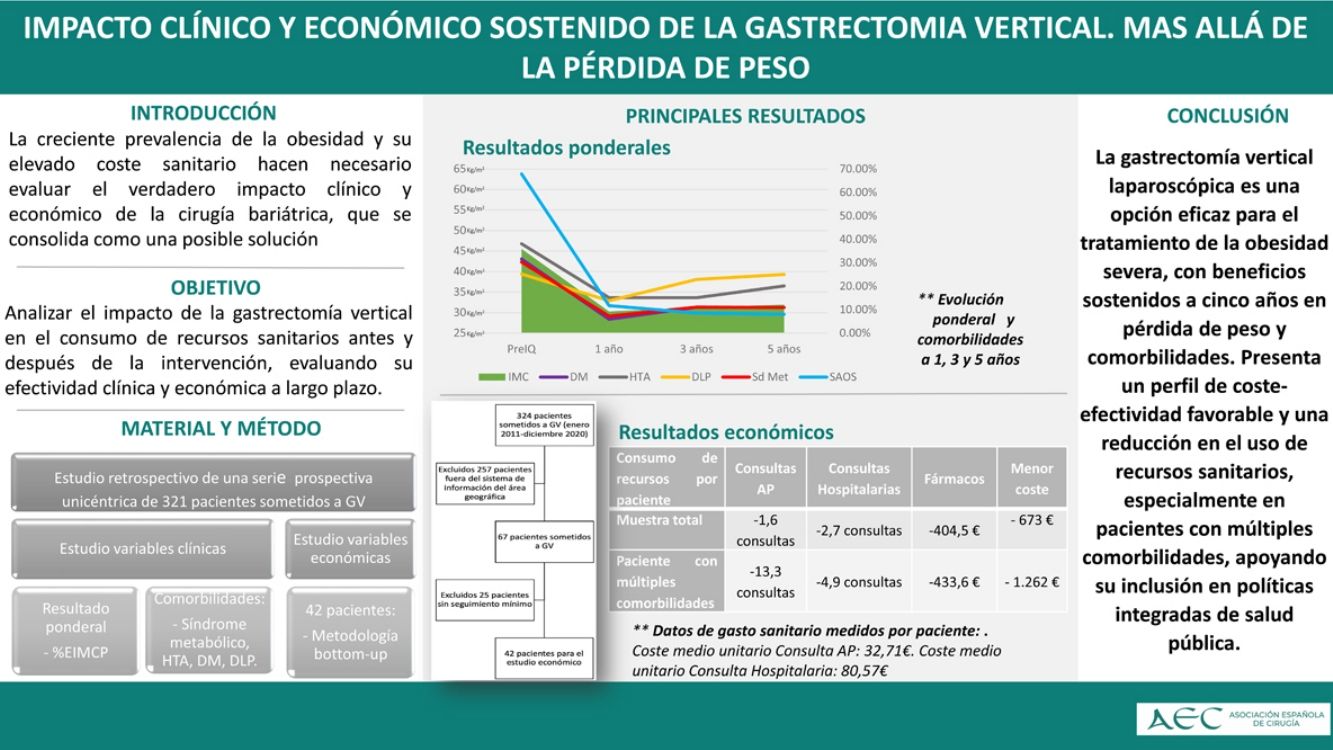 ConclusionesLa gastrectomía vertical es una intervención eficaz y segura, con beneficios clínicos sostenidos y una reducción significativa del gasto sanitario, especialmente en pacientes con múltiples comorbilidades. Estos resultados refuerzan su inclusión en estrategias de salud pública orientadas a la sostenibilidad del sistema sanitario.