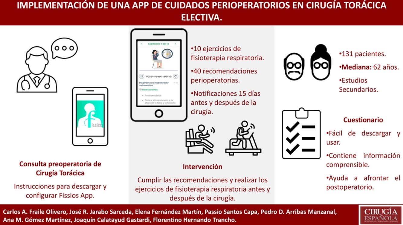 ResultsOne hundred fourpatients were included, the 60.3% were men with a median age of 62 years (51-71), and 26.72% had completed high school. The 89.3% of patients highlighted the ease of downloading and setting up the app. More than 90% of patients positively assessed clarity in explaining chest physical exercises and perioperative recommendations. One hundred four (79.4%) patients highlighted the contribution of the use of the app during the preoperative period to face the postoperative period.
