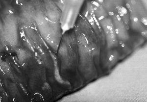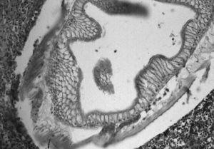Varón de 63 años que presenta dolor abdominal difuso e intenso, asociado a náuseas, vómitos y fiebre. El paciente manifestó que había ingerido boquerones (Engraulis encrasicholus) en vinagre 3 días antes. En la exploración destacaba un abdomen distendido, timpanizado con peritonismo generalizado. La analítica revelaba leucocitosis con neutrofilia y en la tomografía computarizada (TC) abdominal se apreciaba un segmento de íleon distal de unos 15 cm muy engrosado, con asas intestinales proximales muy dilatadas, abundante líquido intraperitoneal y engrosamiento del antropíloro. En la intervención quirúrgica se objetivó una zona de ileítis perforada con un exudado fibrinopurulento sobre una serosa muy congestiva. Se resecó el segmento afectado, cuyo examen macroscópico reveló la presencia de un parásito (fig. 1; punta de aguja) en una zona fisurada de la mucosa. Existía, además, un importante edema transmural con múltiples erosiones y petequias en la mucosa. El examen histopatológico confirmó la presencia transmural de un parásito tipo Anisakis sp., así como un importante edema e infiltración periparasitaria y transmural de neutrófilos, eosinófilos, linfocitos y células plasmáticas (fig. 2).
