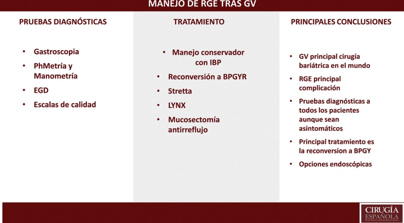 Una gran parte de los pacientes con RGE van a responder a tratamiento con IBP. Sin embargo, habrá una parte de estos pacientes que vayan a requerir algún tipo de intervención. La cirugía revisional es un procedimiento efectivo y seguro tras el fracaso de la GVL, y el BPGYL es la técnica de elección en caso de la presencia de RGE o esofagitis.