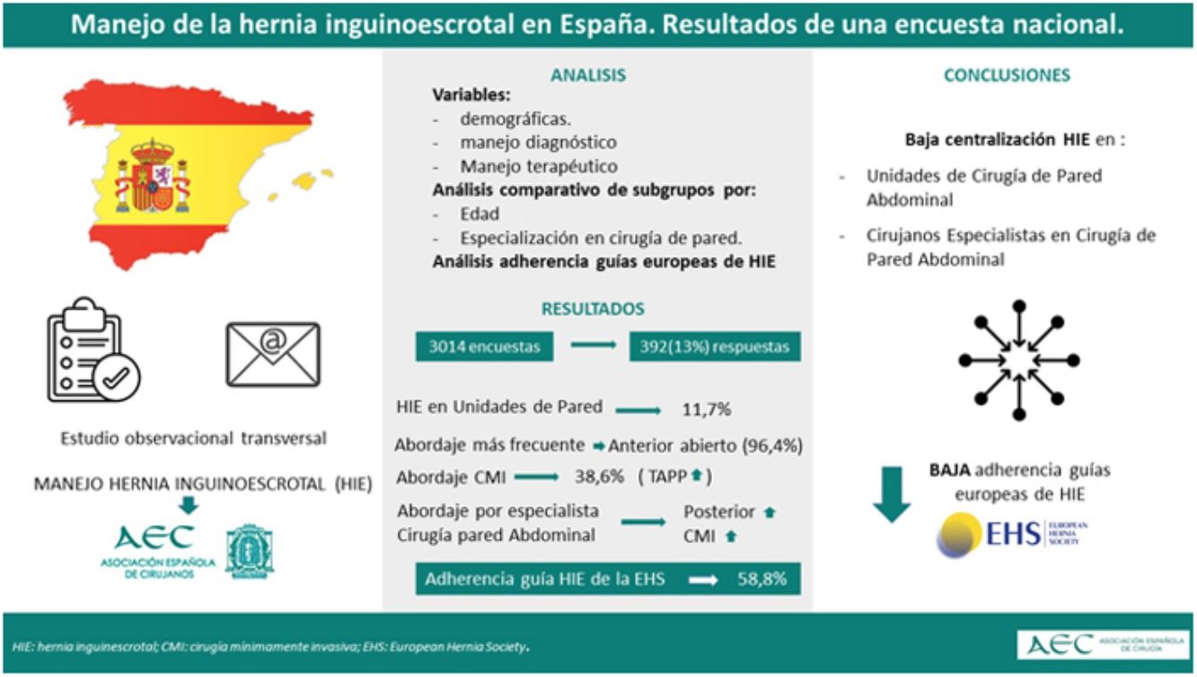 MétodosEstudio observacional transversal mediante encuesta online distribuida entre los miembros de la Asociación Española de Cirugía (AEC). Se recogieron variables demográficas y datos específicos sobre el manejo diagnóstico y terapéutico de la HIE. Se analizaron subgrupos por edad y especialización en cirugía de pared.