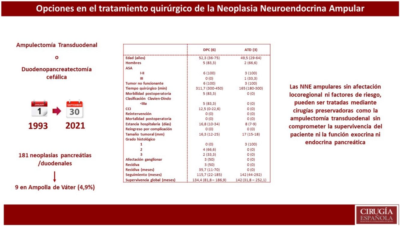 El objetivo del estudio fue analizar los resultados del tratamiento quirúrgico de las neoplasias neuroendocrinas (NNE) ampulares mediante Ampulectomía transduodenal (ATD) y duodenopancreatectomía cefálica (DPC), en un centro de referencia en patología hepatobiliopancreática.