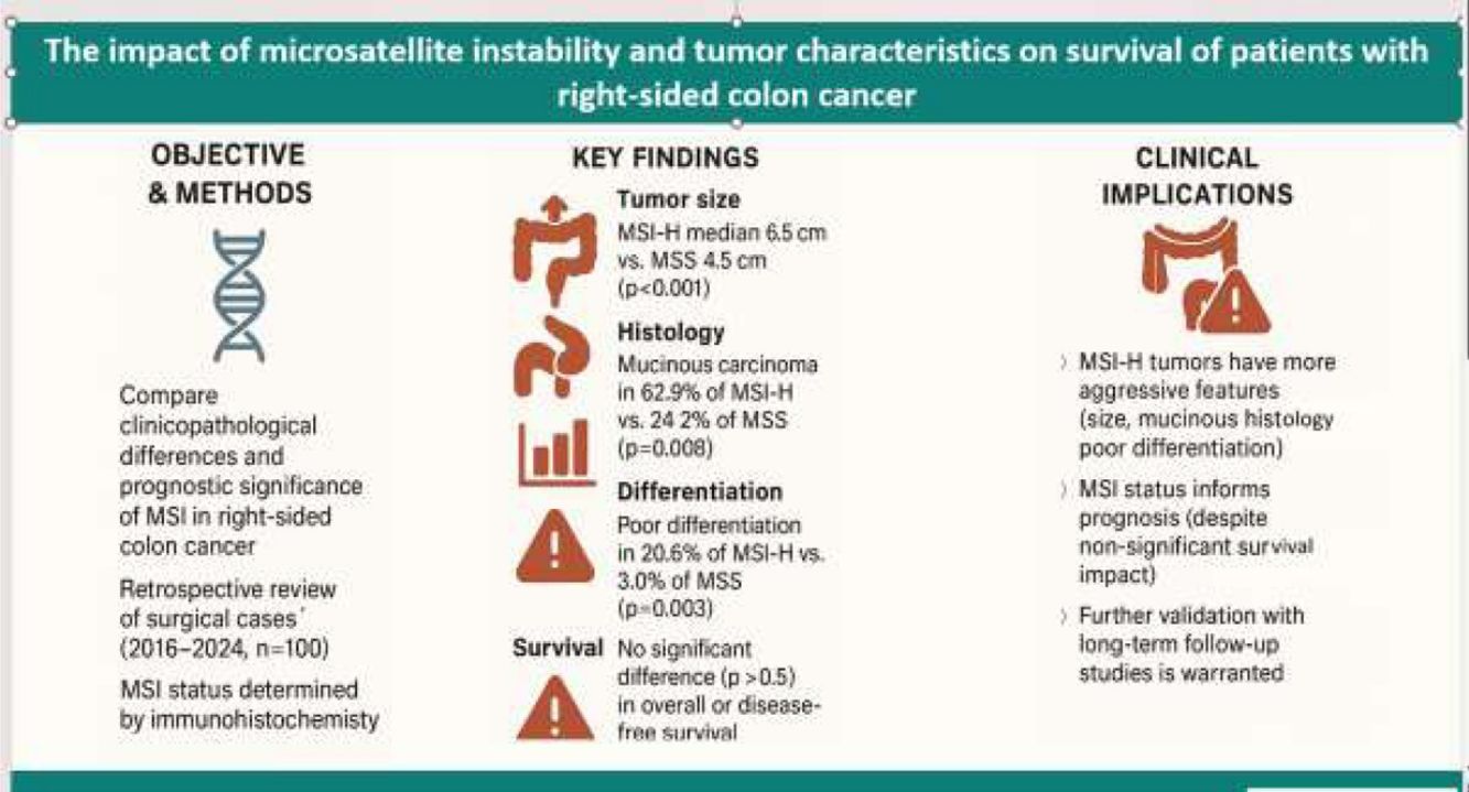 MethodsHistorical records of patients who underwent surgery for right-sided colon cancer between 2016 and 2024 were evaluated retrospectively. Immunohistochemistry was used for the determination of MSI status, and data on tumor characteristics, lymph node metastasis, carcinoembryonic antigen (CEA) levels, and survival outcomes were analyzed. Comparisons were performed to assess differences between the MSI-H and MSS groups, where P < .05 was considered statistically significant.