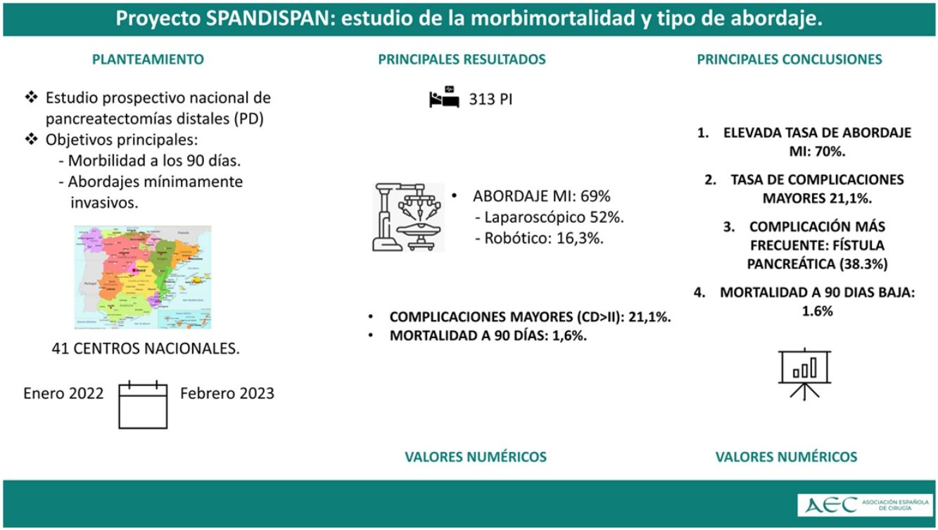 La pancreatectomía izquierda (PI) es una técnica quirúrgica de baja mortalidad, pero alta morbilidad (30%), especialmente la fístula pancreática (FP). Su realización por abordaje mínimamente invasivo (MI) se ha popularizado, pero su implantación en España es desconocida. Presentamos un estudio multicéntrico nacional de PI para determinar morbimortalidad, FP y porcentaje de abordaje MI.
