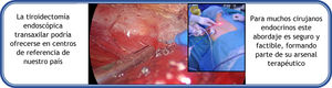 La tiroidectomía endoscópica, utilizada principalmente en países orientales, podría ofrecerse en centros de referencia de nuestro país. Se accede a la región cervical con dos puertos de entrada axilar y uno periareolar. Como referencias destacan: el cartílago cricoides (superior), horquilla esternal (inferior) y borde externo del músculo ECM (contralateral). Se procede a completar la lobectomía más istmectomía tiroidea preservando el nervio laríngeo recurrente sin traccionarlo, dado el acceso lateral. Tras 48h sin incidencias, se retira el drenaje y se da el alta. Este abordaje es seguro y factible para muchos cirujanos endocrinos, formando parte de su arsenal terapéutico.