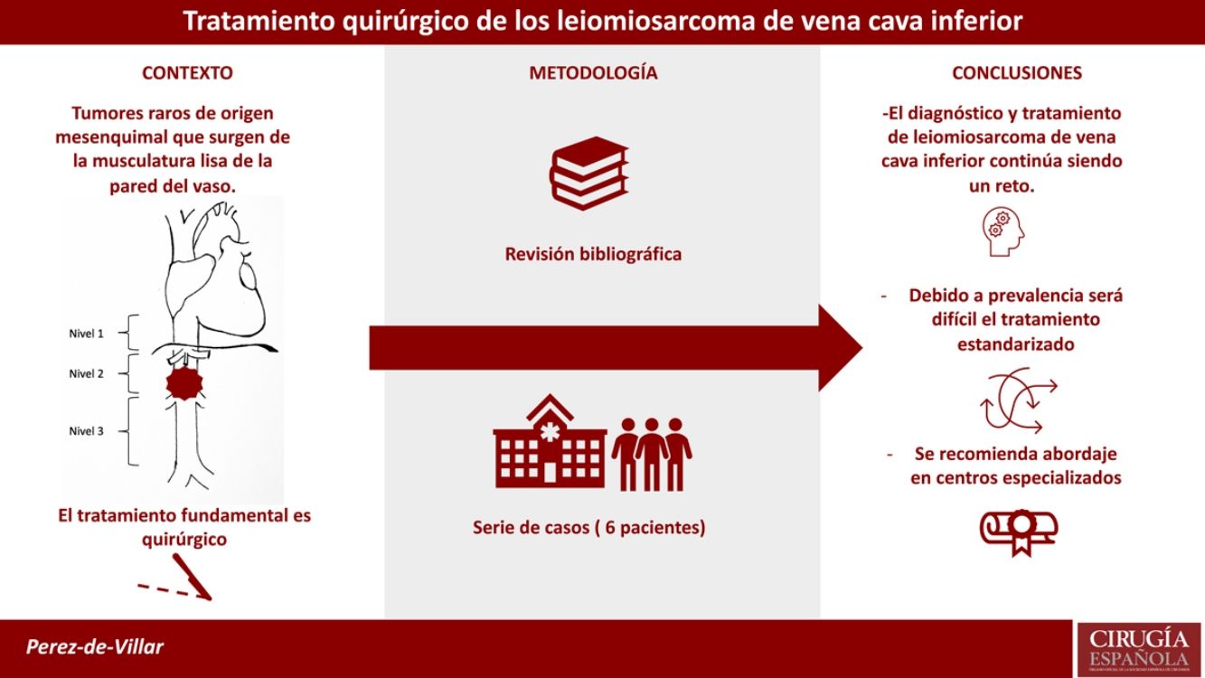 ConclusionThe diagnosis and treatment of inferior vena cava leiomyosarcoma is still a challenge. Due to its low prevalence, it will be difficult to establish a totally standardized treatment and its approach is recommended in specialized centers. On the other hand, a multicentric study should be made to collect the most cases as possible in order to advance in the understanding of the approach to this disease.