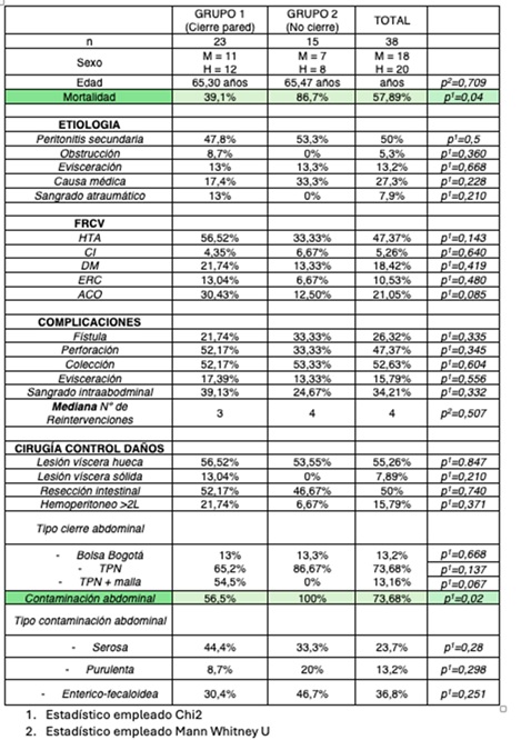 Métodos: Estudio retrospectivo descriptivo longitudinal en un hospital terciario entre los años 2020 y 2024. Se establecieron dos cohortes de pacientes, diferenciadas en función de la consecución o no del cierre fascial primario. Tras evaluar la comparabilidad estadística de los grupos, se estudiaron variables clínicas relevantes pre e intraoperatorias, la técnica quirúrgica empleada para el cierre temporal del abdomen y las complicaciones posoperatorias desarrolladas en cada grupo. Los pacientes estudiados se dividieron en dos grupos (1: cierre de pared, 2: no cierre de pared) Ambos grupos fueron comparables en cuanto a edad, sexo y factores de riesgo cardiovasculares, así como en la técnica quirúrgica empleada en el cierre temporal de pared (bolsa de Bogotá, terapia de presión negativa o terapia de presión negativa acompañada de cierre dinámico con malla).
